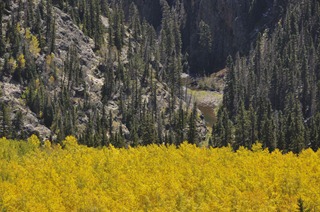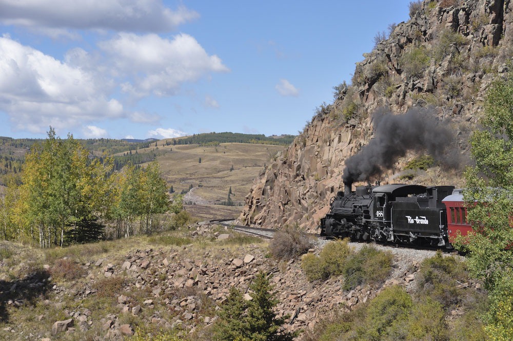 Whole hillsides of Aspens, we're about a week off their peak / train disappearing behind massive fingers of rock