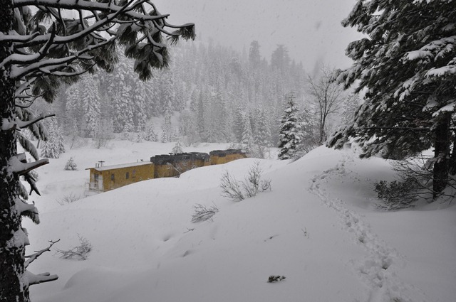 Found a great spot to hide, even had pine needles so I didn't have to sit on snow, and was reasonably sheltered. The snow was coming down very heavily here, so any shelter was worthwhile. Knew the flanger would be back and heard the loco radio to the flanger to lift their blade so knew he was close by. (The flanger plows the snow out of the centre of the track, so whenever they come to a crossing or points they need to lift the blade, otherwise they'd foul it.)